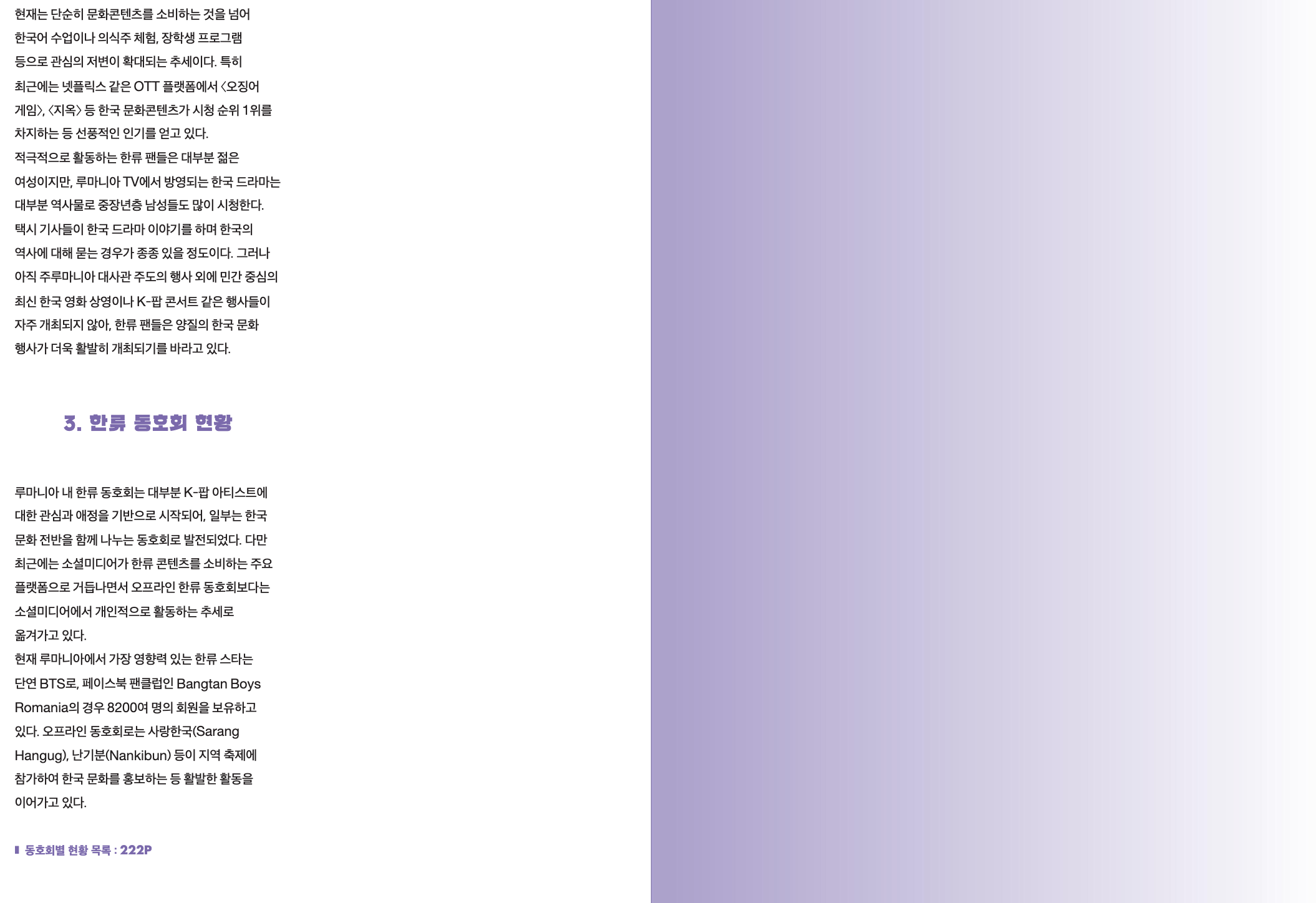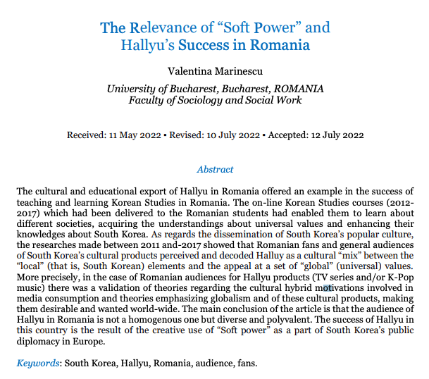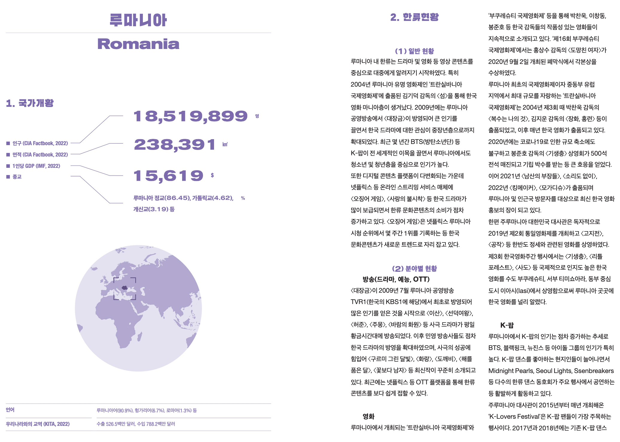 똑똑한 여행/루마니아 루마니아의 한류는 어떤가요? 자료 조사 해봤습니다. by 블뽁 2023. 11. 13. 반응형 1. 루마니아의 한류는 어떤가 한번 조사 해봤습니다. 2022년 자료가 있네요. 자료중에 이런것도 있네요. 리포트 2. 지구촌 한류 현황이라는 데서 발췌해봤습니다. 지구촌 한류현황이라고 체계적으로 조사하는 곳도 있고 많네요. 반응형 공유하기 게시글 관리 똑똑블로그 '똑똑한 여행 > 루마니아' 카테고리의 다른 글 클루지나포카 에도 지하철을 만드나 봅니다. Alstom to provide integrated metro system for the city of Cluj-Napoca in Romania (0) 2023.11.13 클루지 국제공항이 있어요. 아브람 이안쿠 클루지 국제공항 (IATA: CLJ, ICAO: LRCL)은 루마니아 클루지나포카 시에 소재하는 공항입니다. (0) 2023.11.13 클루지나포카 (Cluj-Napoca) 의 주요 음식, 식생활은 뭔가요? 주로 뭘 먹나요? (0) 2023.11.13 루마니아 클루지나포카 (Cluj-Napoca) 도시 3대 관광지 추천해달라고 하면 뭘까요? (0) 2023.11.13 루마니아 클루지나포카 (Cluj-Napoca) 도시의 주요 경제적인 수입원은 뭘까요? 어떤 경제활동을 통해서 세수를 얻을까요? (0) 2023.11.13 관련글 클루지나포카 에도 지하철을 만드나 봅니다. Alstom to provide integrated metro system for the city of Cluj-Napoca in Romania 클루지 국제공항이 있어요. 아브람 이안쿠 클루지 국제공항 (IATA: CLJ, ICAO: LRCL)은 루마니아 클루지나포카 시에 소재하는 공항입니다. 클루지나포카 (Cluj-Napoca) 의 주요 음식, 식생활은 뭔가요? 주로 뭘 먹나요? 루마니아 클루지나포카 (Cluj-Napoca) 도시 3대 관광지 추천해달라고 하면 뭘까요?