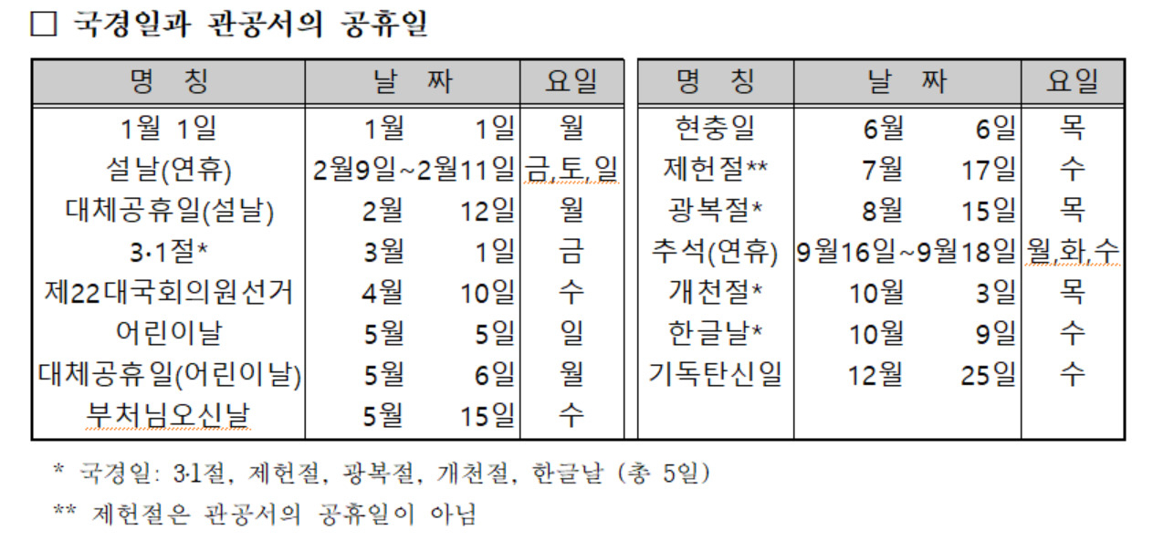 주5일 근무 체제의 기관에서는 총 119일의 휴일이 있으며, 토요일을 포함해 120일이 되지만, 토요일과 겹치는 1일(설날 연휴 둘째 날)을 제외하면 실질적인 휴일은 119일로, 이는 올해보다 2일 더 많은 수치이다. 주5일 근무 체제에서는 3일 이상의 연휴가 총 5번 발생한다.