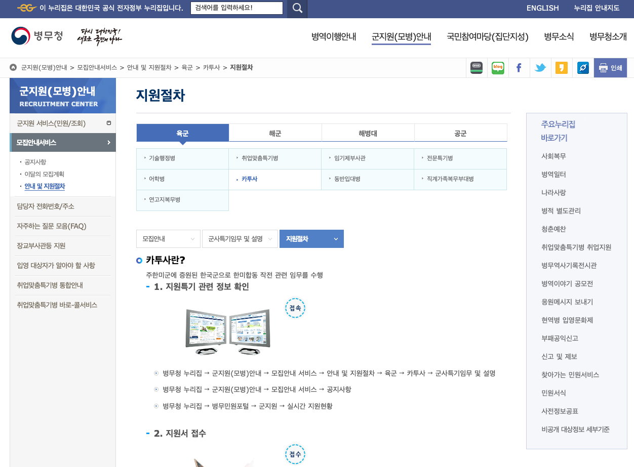 - 카투사 모집 공고에 관한 세부 사항은 병무청 사이트에서 확인 가능합니다.